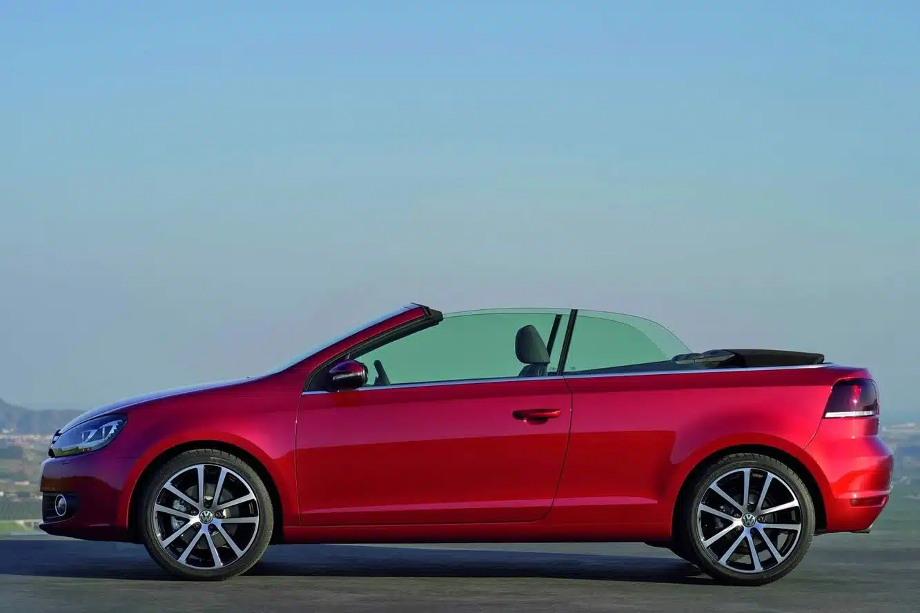 Ça y est, la mamie a une nouvelle petite fille. Et la Golf 6 a bien grossi par rapport à la grand-mère, mais l’idée est la même. Le design que tout le monde connaît, ainsi qu’une capote souple. Un système moins encombrant et plus rapide que les toits en dur : 9 secondes pour décapoter, et ce jusqu’à 30 km/h.